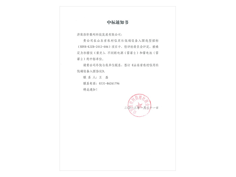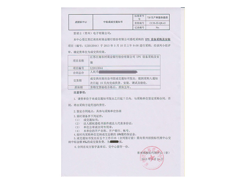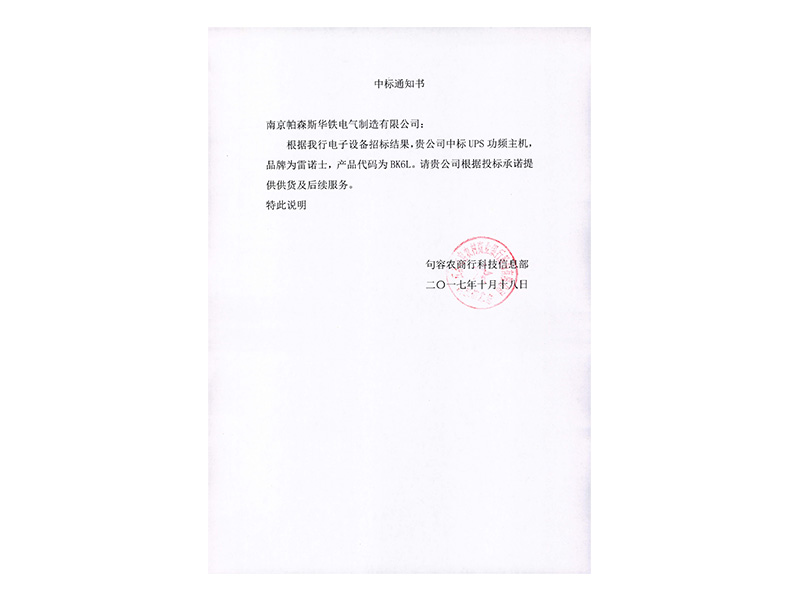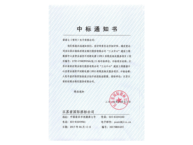 2017年雷諾(nuò)士江南農(nóng)村商業銀行中标通知書